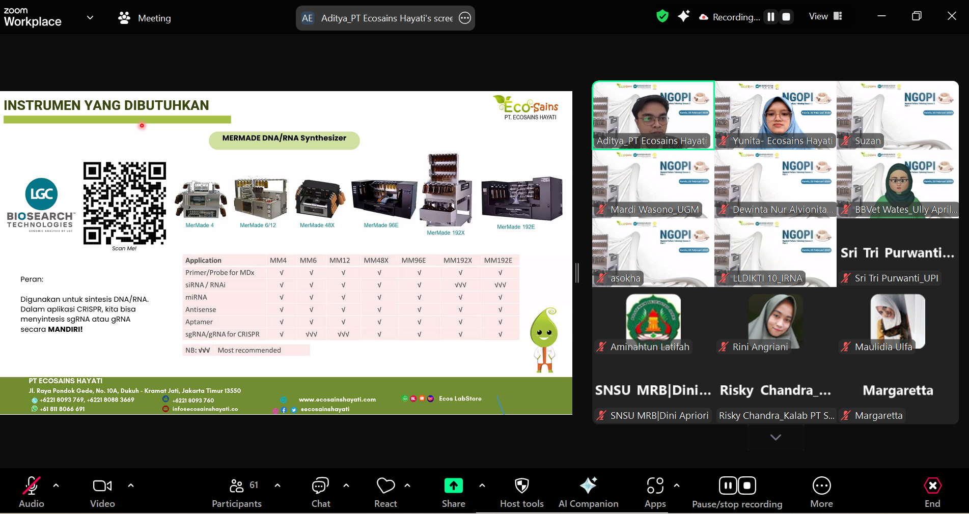Kamis, 20 Februari 2025 – PT Ecosains Hayati kembali menyelenggarakan seri diskusi ilmiah NGOPI (Ngobrol Perkara Teknologi) yang kali ini mengangkat tema “Peran Oligosynthesizer dalam Pengembangan Teknologi CRISPR pada Aplikasi Kesehatan.” Kegiatan dilaksanakan secara daring melalui Zoom Meeting sekitar 103 peserta dan berhasil menarik perhatian para peneliti, akademisi, serta profesional di bidang Life Science yang ingin memahami lebih jauh peran oligonukleotida dan teknologi sintesis oligo dalam pengembangan inovasi berbasis CRISPR.