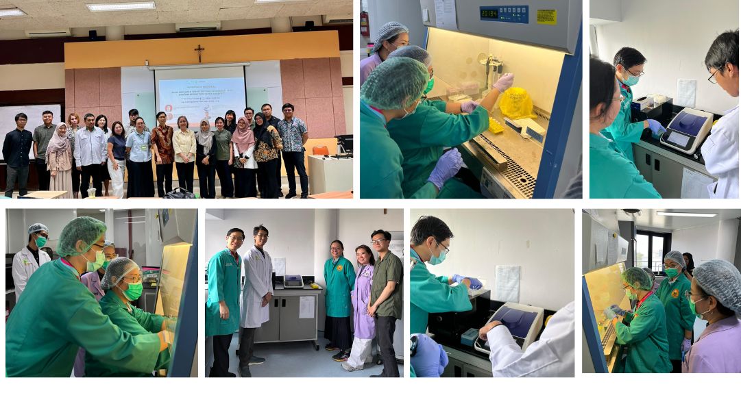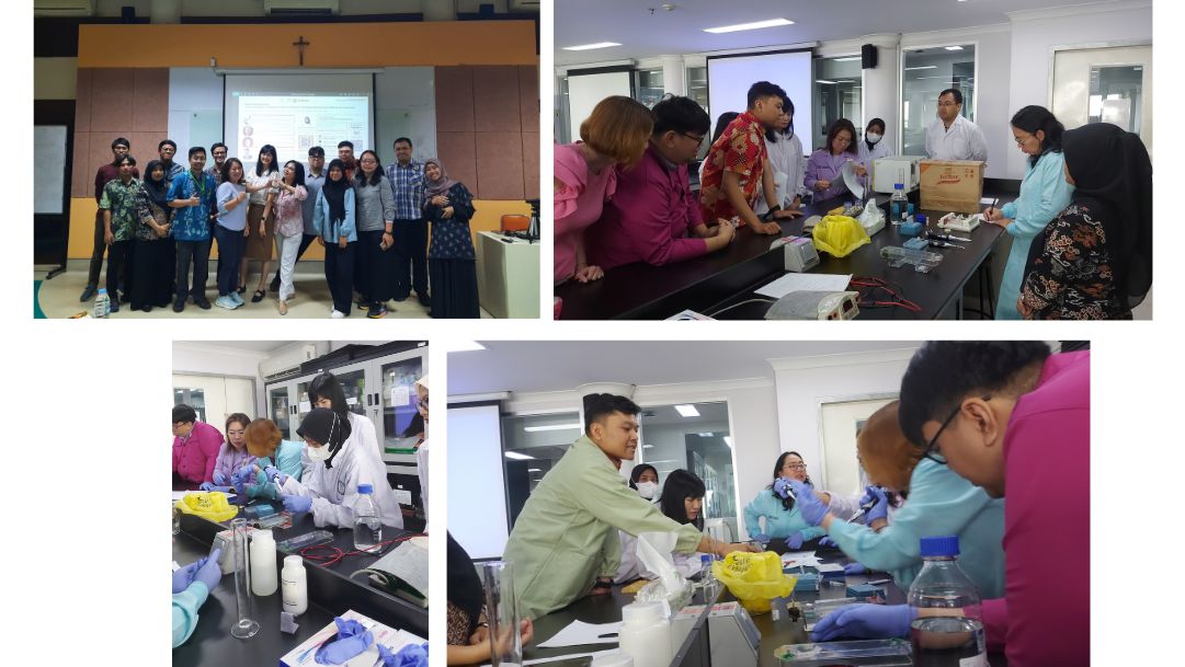 Pada hari ke-empat, peserta melakukan praktik elektrophoresis dengan tema "Gel Electrophoresis and Bioinformatic Analysis of PCR Products" bersama Bapak Ferbian Milas Siswanto, Ph.D, dosen di UNIKA Atma Jaya. Dalam praktik laboratorium, peserta belajar menyiapkan gel agarosa 2% yang dilarutkan dalam buffer TAE atau TBE, ditambahkan SYBR Green sebagai loading dye, dan dituangkan ke cetakan gel untuk memadat. Proses elektroforesis kemudian dilakukan dengan menempatkan gel dalam chamber berisi buffer, memasukkan sampel PCR bersama marker ke sumur gel, dan mengalirkan arus listrik sehingga fragmen DNA bermuatan negatif bergerak menuju elektroda positif. Fragmen yang lebih kecil bergerak lebih cepat, memungkinkan pemisahan DNA berdasarkan ukuran. Setelah proses selesai, gel divisualisasikan menggunakan UV atau blue light transilluminator, dan pita DNA dibandingkan dengan marker untuk menentukan ukuran serta keberhasilan amplifikasi.