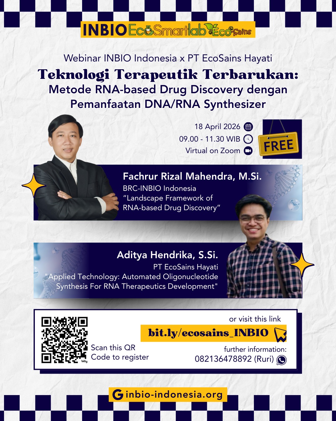 Melalui webinar ini, kita akan membahas bagaimana DNA/RNA Synthesizer dimanfaatkan dalam pengembangan terapi berbasis RNA, mulai dari konsep hingga penerapannya dalam riset dan teknologi biomedis.
