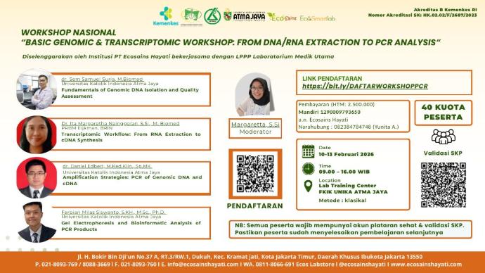 Workshop kolaborasi PT Ecosains Hayati bersama FKIK Universitas Katolik Indonesia Atma Jaya. Workshop ini berfokus pada pemahaman dan peningkatan skills di bidang biologi molekuler, mulai dari ekstraksi, penggunaan metode Polymerase Chain Reaction, RT-PCR, hingga teknik elektroforesis.